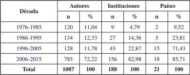 La cantidad de autores, instituciones y países representados en la revista Estudios Pedagógicos distribuidos por década muestra una tendencia creciente a lo largo del tiempo, con excepción del número de autores de la década 1996-2005, donde es posible apreciar cifras más altas durante el último periodo analizado.