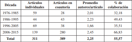 Además, la predominancia de trabajos realizados individualmente durante el periodo 1976-1985 con una tasa del 32,18% de colaboración contrasta con el aumento del número de artículos realizados en coautoría durante el periodo 2006-2015 alcanzando hasta el 66,83% de colaboración. A pesar de este aumento de los trabajos desarrollados en coautoría, las redes de colaboración apenas han variado ligeramente su estructura, al seguir predominando los grupos de investigación formados por dos académicos.