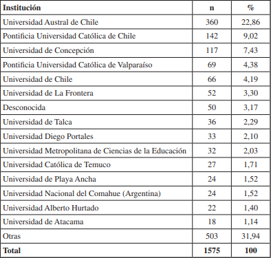 La distribución de firmas por institución (Tabla 5) mostró la predominancia de los trabajos desarrollados en la Universidad Austral de Chile (22,86%), con más del doble de representación que la Pontificia Universidad Católica de Chile (9,02%), mientras que el resto de instituciones no superaron el 8% del total de firmas respectivamente.