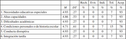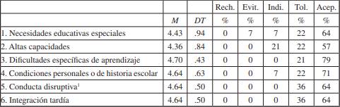 Los maestros entrevistados se describieron a sí mismos con actitudes muy favorables hacia la atención del alumnado con necesidades específicas de apoyo educativo (M = 4.88). No obstante, destacaron las actitudes positivas hacia el alumnado con necesidades educativas especiales (M = 4.93, DT = .27), alumnado con dificultades específicas de aprendizaje (M = 4.93, DT = .27), alumnado con conductas disruptivas (véase nota 1 al final del documento) (M = 4,93, DT = .27) y hacia el alumnado con necesidades por integración tardía (M = 4.93, DT = .27). La media más baja fue la obtenida para el alumnado con necesidades por condiciones personales o de historia escolar (M = 4.71, DT = .61), aunque las actitudes también resultaron favorables. Según la opinión del 93% del profesorado, la “aceptación” era la actitud que predominaba a la hora de atender al alumnado con necesidades educativas especiales, con altas capacidades, con dificultades específicas de aprendizaje y con necesidades derivadas de su conducta disruptiva e integración tardía. El 78% de estos docentes también escogió la “aceptación” como la actitud que mejor definía su actuación con el alumnado con necesidades por condiciones personales o de historia escolar. Además, solo el 7% eligieron la “indiferencia” como la actitud que mantenían hacia el alumnado con dificultades por condiciones personales o de historia escolar.