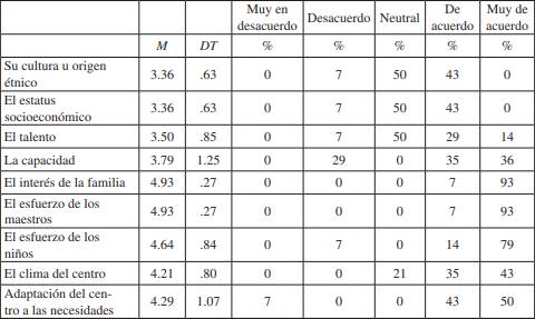 Tal y como muestran los resultados, los participantes otorgaron una importancia elevada a la mayoría de los posibles factores influyentes en el rendimiento, sobre todo a aquellos que tenían que ver con el contexto en el que se desarrolla el proceso educativo de los discentes (M = 4.11). De este modo, según este grupo de docentes, los factores más influyentes en el rendimiento serían el interés de la familia (M = 4.93, DT = .27) y el esfuerzo realizado por los maestros (M = 4.93, DT = .27). Tras estos factores se situaron otros elementos con un nivel de influencia menor como el talento (M = 3.50, DT = .85), el estatus socioeconómico (M = 3.36, DT = .63) y el origen cultural (M = 3.36, DT = .63). Estos datos reflejaron que, la mayoría de los encuestados (93%), opinaban que el esfuerzo de los docentes y el interés de la familia eran los factores más influyentes en el rendimiento, mientras que únicamente el 14.3% opinaban que era el talento. Además, el 29% estaban en desacuerdo a la hora de considerar la capacidad de los alumnos como un factor influyente en su rendimiento.
