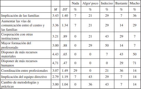 Tras el análisis de los resultados, las necesidades más importantes, según los docentes encuestados, eran el aumento de recursos humanos (M = 4.71, DT = .47) y el aumento de recursos materiales (M = 4.43, DT = .65). Así mismo, también se consideraron importantes el aumento de la implicación familiar (M = 3.43, DT = 1.40), el incremento de las vías de comunicación entre el centro y las familias (M = 3.36, DT = 1.34) y la cooperación con otras instituciones (M = 3.21, DT = .89). Las necesidades con puntuaciones menores, pero que también deben ser tenidas en cuenta, fueron la coordinación entre los profesionales del centro (M = 3.07, DT = 1.49), el aumento de la formación del profesorado (M = 3.00, DT = .88), el cambio de metodologías y prácticas (M = 3.00, DT = 1.04) y la implicación del equipo directivo en último lugar (M = 2.79, DT = 1.19). La mayoría de los participantes (71%) afirmaron que el incremento de recursos materiales era la principal necesidad a abordar para la mejora de la calidad en la atención a la diversidad, seguida del 50% que escogieron el aumento de recursos materiales. Según los encuestados, las necesidades que presentaban una menor importancia eran la cooperación con otras instituciones y la mejora de la formación del profesorado (7%). Además, el 43% opinaba que la implicación del equipo directivo era poco importante, mientras que el 29% no otorgó ningún tipo de importancia a la coordinación entre los profesionales que componen el centro a la hora de atender a la diversidad.