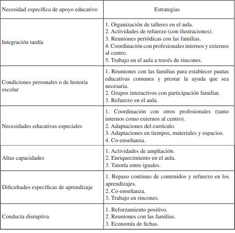 En la Tabla 5 se muestran los resultados extraídos de la quinta pregunta, de carácter abierto, que permitía a los docentes enumerar las actuaciones que llevaban a cabo con el alumnado con necesidades específicas de apoyo educativo.