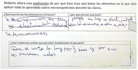 Cada una de estas situaciones fue acompañada del andamio escrito en sus diversas fases de retiro gradual (ver Anexo 2). Cada vez que se presentaba una situación a explicar, se les ofrecía el andamio escrito, con monitoreo docente de tipo individual. Con el fin de individualizar los apoyos y adaptarse a la contingencia de aprendizaje de cada estudiante, antes de la siguiente situación a explicar, el docente entregaba el producto anterior revisado y comentado por escrito, junto a un ejercicio metacognitivo oral con el pleno de los y las estudiantes. Ejemplos de ejercicio metacognitivo, fueron preguntas como: Si otra persona, que no sabe acerca de microorganismos lee tu explicación ¿podrá comprender que la descomposición de los alimentos se debe a la proliferación de microorganismos? ¿qué nos falta por aprender para lograrlo?