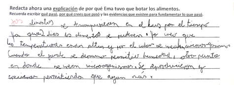 Ejemplo de retiro de andamios, en el que se observa progreso de un estudiante al explicar un fenómeno natural en una situación de la vida diaria (los comentarios realizados por el maestro fueron borrados para no interferir en la lectura del producto del estudiante).