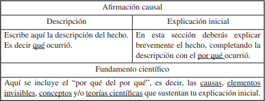 Entendida la explicación científica escolar en la educación primaria como una articulación lingüística que da sentido causal a un fenómeno en este estudio, el andamio que se utiliza se configura a partir de una descripción de la situación ocurrida u observada (Jorba, Gómez y Prat, 2000) que, unida por un conector causal, presenta una causa o condición específica como explicación inicial. Ambas, descripción y explicación, conforman la afirmación causal (McNeill, Lizotte, Krajcik y Marx, 2006; McNeill y Krajcik, 2009; Ruiz-Primo, Li, Tsai y Schneider, 2010; Zangori y Forbes, 2013), dando contexto al relato explicativo. Esta afirmación causal, que es la que debe ser sustentada por el estudiante, se completa con un fundamento científico (Braaten y Windschitl, 2011; Park et al., 2020; Yao y Guo, 2018), enriqueciendo y transformando las explicaciones de la vida diaria (Zangori y Forbes, 2013), lo que le da su carácter científico (ver Tabla 1 en la siguiente página). Sobre la base de este concepto de explicación científica escolar también se diseñó una rúbrica para la evaluación de las explicaciones generadas durante una unidad pedagógica específica (Tabla 2).