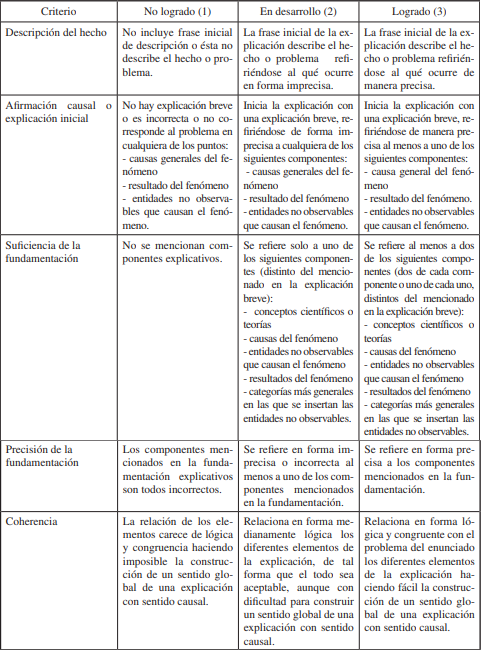 La construcción de la rúbrica de evaluación respondió a la estructura del andamio (Tabla 2) y se llevó a cabo sobre la base del esquema de Jorba et al. (2000), para la evaluación de explicaciones que es aplicable a varias disciplinas. Se hizo uso del esquema general, integrándose los criterios de evaluación de la calidad de una explicación científica escolar tanto de los estudios clásicos de Lee y Songer (2004) y McNeill et al. (2006), como las revisiones de Braaten y Windschitl (2011) de Zangori y Forbes (2013) y Yao y Guo (2018), sumando a estos el elemento de precisión conceptual con relación a la unidad de aprendizaje específica. Tal como se ha recomendado en otros trabajos orientados a la evaluación de explicaciones científicas escolares (De Andrade, Freire y Baptista, 2019; Yao y Guo, 2018) los cinco criterios de ésta condensan tanto los avances en las habilidades para construir explicaciones con sus diferentes componentes, como los avances en la comprensión de los conceptos científicos, al evaluar la precisión y suficiencia del contenido de cada componente de la explicación.