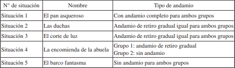 Respecto del andamio implementado, en el presente estudio se decidió insertar -tal como lo propone Hsu et al. (2015)-, en un sistema de andamiaje que incluye el apoyo directo del docente, trabajo entre pares o grupos pequeños, ejercicios de metacognición, entre otros. Estos apoyos fueron constantes para cada grupo. El andamio escrito de retiro gradual aplicado para ambos grupos en todas las situaciones a explicar (desde la n° 1 a la n°4) presentadas a los y las estudiantes, se configura como variable independiente en el momento en que, al final de la experiencia, se quita por completo a un grupo.