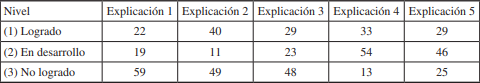 En la Tabla 4 se presentan los porcentajes de explicaciones en cada nivel de logro en las cinco situaciones como respuesta a la pregunta de investigación relacionada con la posibilidad de observar avances en las explicaciones de estudiantes acompañados por el sistema de andamios propuesto. El nivel en desarrollo presentó un constante aumento en frecuencia sobre todo en las últimas dos explicaciones y, tal como en el nivel logrado, se observó un retroceso en la explicación cinco, aunque no igualable a los niveles descendidos de las primeras explicaciones. En el nivel logrado el progreso fue evidente desde la explicación dos y se mantuvo relativamente constante desde la explicación tres en adelante. Las cifras demuestran que los y las estudiantes avanzaron, en su mayoría, desde el nivel no logrado al nivel en desarrollo durante la unidad de aprendizaje. Más adelante se describe una posible razón atribuida al descenso del porcentaje en nivel logrado de la explicación cinco.