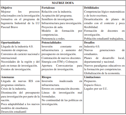 Los árboles de problemas, y de medios y fines muestran como el mejoramiento de los procesos en investigación formativa requieren no sólo de inversión en infraestructura adecuada, sino además de la formulación de planes de estudio pertinentes, así como la participación y compromiso de la comunidad académica en general, incluyendo obviamente a las empresas. Así mismo, se evidencia la importancia de elaborar estrategias para la investigación que estén en concordancia con la realidad del contexto en que se desempeñan los ingenieros industriales del país, de manera que estos puedan adquirir competencias investigativas adecuadas con las exigencias del mercado. Lo anterior se ve evidenciado también en la Matriz DOFA, la cual sirve como herramienta para la estrategia de investigación que se pretenda formular.
