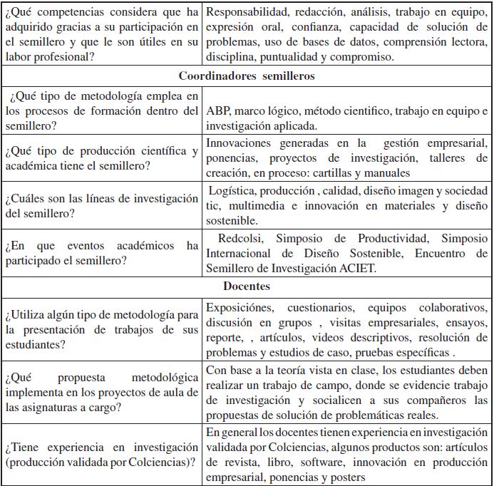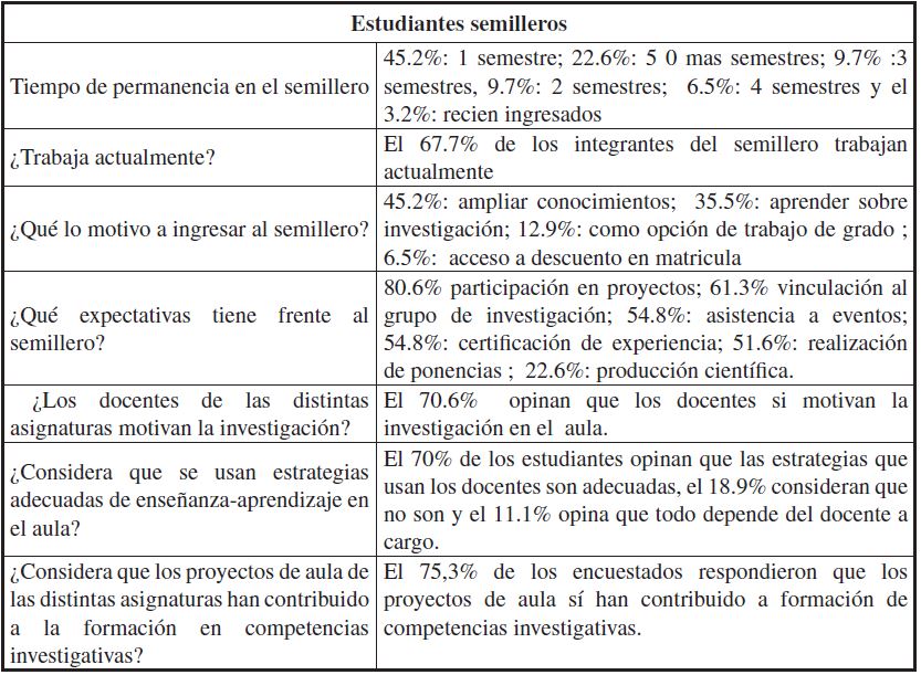 El 100 % de los semilleristas ha participado en algún proyecto de investigación. Entre las herramientas metodológicas que han mejorado gracias a la participación en el semillero se encuentran: manejo de fuentes de información, análisis cualitativo, nivel de redacción y análisis matemático. De igual manera, han adquirido competencias tales como: redacción y análisis, aplicación del conocimiento en la práctica, trabajo en equipo, liderazgo, responsabilidad, interpretación de información. El 90,3 % de los semilleristas consideran importantes los proyectos de aula, ya que en ellos se adquieren competencias investigativas y un 96,8 opinan que han tenido un buen acompañamiento por parte del coordinador del semillero.