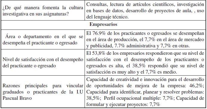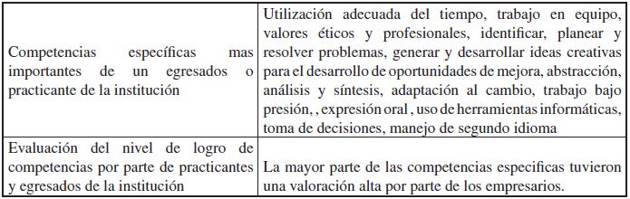 El 50 % de las empresas encuestadas son medianas, el 25% grande, y las demás son pequeña y microempresas, el 83,3 % pertenecen al sector privado. El área donde más se desempeñan practicantes o egresados en estas empresas es la de producción (75 %); un 58,3 % de los empresarios manifiestan un alto nivel de satisfacción con el desempeño de los practicantes o egresados de la institución y un 33.3 % muy alto; las razones más comunes por las cuales estos son contratados son: capacidad de creatividad, innovación y desarrollo de oportunidades, capacidad para identificar, planear, verificar, controlar y mejorar procesos productivos. Las empresas le dan una calificación alta en la valoración de las siguientes competencias específicas: trabajo en equipo, logros de objetivos, propuesta de mejoramiento, competencias actitudinales, utilizan adecuado el tiempo, trabajo independiente sin supervisión, aplican valores éticos y profesionales, buscan y analizan para dar solución, adaptación al cambio, trabajo bajo presión.