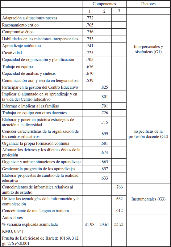 La Tabla 1 muestra los resultados del análisis factorial de las competencias genéricas. La prueba de KMO muestra un resultado de 0.94 (muy alto) indicando que las correlaciones entre parejas de ítems pueden ser explicadas por los restantes ítems seleccionados y la prueba de esfericidad de Barlett muestra que los ítems no son independientes (10169, 312; gl. 276 p<0.001) y, por ello, lo apropiado de este análisis. En torno al factor 1 (G1) se agrupan las competencias interpersonales y sistémicas (González & Wagenaar, 2003), sobre el factor 2 (G2) las competencias específicas de la profesión docente (aquellas que cualquier profesor debe dominar para desarrollar su labor en un centro educativo) y el factor 3 (G3) será el que agrupe las competencias instrumentales.