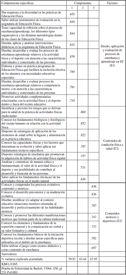La Tabla 2 muestra los resultados del análisis factorial de las competencias docentes específicas. Al igual que en el anterior la prueba de KMO y la prueba de esfericidad de Barlett muestran la idoneidad de este análisis. En torno al factor 1 (E1) se agrupan las competencias relacionadas con el diseño, desarrollo/aplicación, análisis y evaluación de intervenciones didácticas y procesos de enseñanza y aprendizaje. A este factor le hemos denominado “Diseño, aplicación y evaluación de procesos de enseñanza y aprendizaje (e-a) en educación física (EF)”. El segundo factor (E2) se relaciona con la actividad física, condición física y salud, para este trabajo “Contenidos de condición física y salud”. Y el tercer factor (E3) está relacionado con los contenidos de habilidades motrices y deportivas, lo denominaremos como “Contenidos motrices y deportivos”.