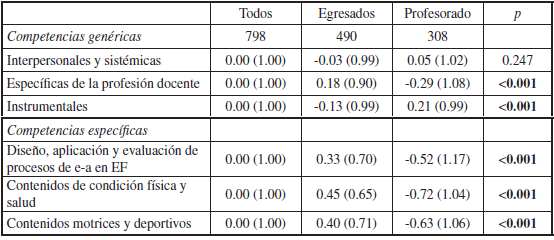 La Tabla 3 presenta Percepción de las competencias desarrolladas en la FI por egresados y profesorado universitario. Las diferencias entre profesorado y egresados se analizaron con la t de student. En las competencias genéricas aparecen diferencias significativas entre los grupos en las competencias instrumentales (p<0.001) y en las competencias específicas de la profesión docente (p<0.001). En el caso de las competencias instrumentales el profesorado obtiene valores más altos (0.13 vs. 0.21) y en las competencias propias de la profesión docente son los egresados los que reportan valores más altos (0.18 vs. -0.29). En las competencias específicas aparecen diferencias significativas en los tres factores estudiados (todos, p<0.001), obteniendo los egresados en todos los factores puntuaciones más altas.