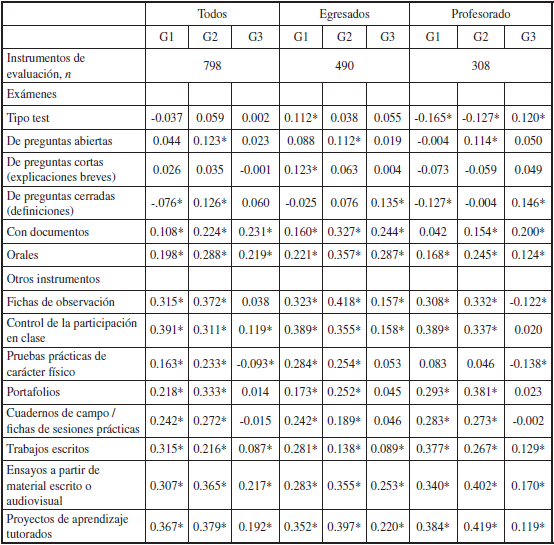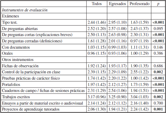 En la Tabla 4 aparecen los descriptivos de la muestra sobre la frecuencia del uso de diferentes instrumentos de evaluación. El instrumento de media más utilizado son los trabajos escritos, le siguen los exámenes de preguntas abiertas, de preguntas cortas y tipo test. El instrumento menos utilizado corresponde a los exámenes orales. Las diferencias entre profesorado y egresados se analizaron con la t de student. Dentro de los diferentes tipos de exámenes, aparecen diferencias en los exámenes tipo test, de preguntas cortas y de preguntas cerradas (p<0.001), reportando los egresados valores más altos. En el resto de instrumentos aparecen diferencias en todos menos en las fichas de observación y los ensayos a partir de material escrito o audiovisual (p>0.05). Únicamente en el caso del control del aprendizaje en clase y los proyectos tutorados, el profesorado reporta valores medios más altos que los egresados.