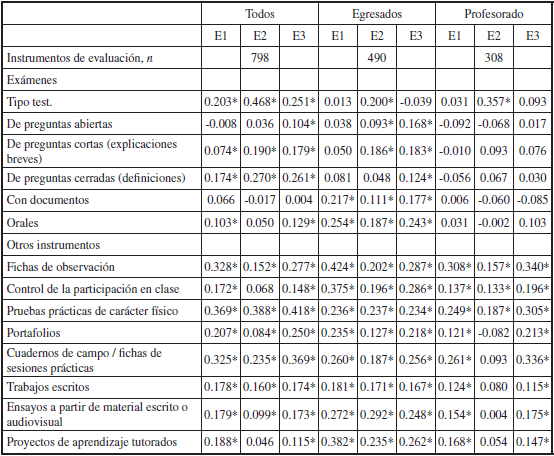 La Tabla 6 muestra la correlación de Pearson entre las competencias específicas y los instrumentos de evaluación de la muestra total y de los egresados y profesorado por separado. Las competencias relacionadas con Diseño, aplicación y evaluación de procesos de enseñanza y aprendizaje en EF, la muestra total las relaciona con las pruebas prácticas de carácter físico (r=0.369), las fichas de observación (r=0.328) y las fichas de sesiones prácticas (r=0.325). El profesorado sí mantiene estos tres instrumentos como los que más se relacionan, pero la visión de los egresados es diferente. Para ellos, los instrumentos que de forma directa más se relacionan son las fichas de observación (r=0.424), los proyectos de aprendizaje tutorados (r=0.382) y el control de la participación en clase (r=0.375). En cuanto a las formas de examen, se establecen pocas relaciones, y todas ellas de carácter débil (r<0.254). Los contenidos de condición física y salud se relacionan de forma directa y más fuertemente en los tres supuestos estudiados (muestra total, egresados y profesorado) con pruebas prácticas de carácter físico (r>0.187) y los exámenes tipo test (r>0.200). Por último, los contenidos motrices y deportivos, la totalidad de la muestra los relaciona con pruebas prácticas de carácter físico (r=0.418), fichas de sesiones prácticas (r=0.369), fichas de observación (r=0.277) y exámenes de preguntas cerradas (r=0.261). Tanto egresados como profesorado coinciden en la relación de las fichas de observación.