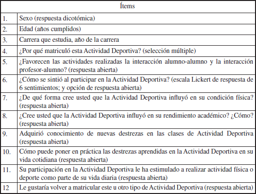 Para recolectar la información de los participantes se confeccionó un cuestionario de auto-reporte. El cual fue validado previamente por el juicio de expertos, de tres profesionales en el área de Ciencias del Movimiento Humano, quienes son profesores de los cursos de Actividad Deportiva de la Escuela de Educación Física y Deportes.