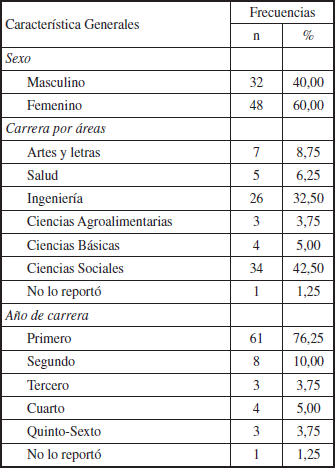 La muestra final consistió de 80 estudiantes universitarios, los cuales completaron el cuestionario de forma voluntaria. En la Tabla 3 se presenta la información de las preguntas 1 y 3.