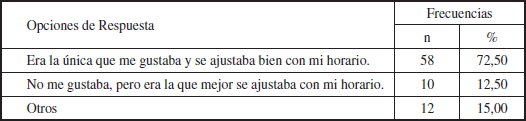 En la pregunta 4 ¿Por qué matriculó esta Actividad Deportiva? Según se muestra en la Tabla 4, la razón que anotan con mayor frecuencia las personas participantes es sentirse a gusto con la actividad deportiva que se ofrece, sumado a la conveniencia de horario que ese curso de actividad deportiva representa para ellos. Asimismo, las personas participantes agregaron otras razones, entre ellas: el deseo de aprender actividades diferentes, no tener la opción de matricular el deporte que más le gusta porque no se ofreció dentro de las opciones posibles, no saber de qué se trataba la actividad deportiva, pero tener la facilidad de que el horario se ajustaba a las necesidades, ajuste entre los horarios ofrecidos para cursar la actividad deportiva y la disponibilidad de tiempo de los estudiantes para matricular el curso, ser la actividad deportiva que les llamaba la atención o ser la opción disponible en el momento de la matrícula. Algunos comentarios específicos son: “quería algo diferente” (sujeto 67), “no había atletismo” (sujeto 11), “no estaba seguro de qué era, pero se ajustaba a mi horario” (sujeto 12), “se ajusta al horario” (sujeto 78), “por rellenar horario” (sujeto 54), “era lo que quedaba” (sujeto 23), “solo esa quedaba” (sujeto 80), “era la única que me llamaba la atención” (sujeto 3).