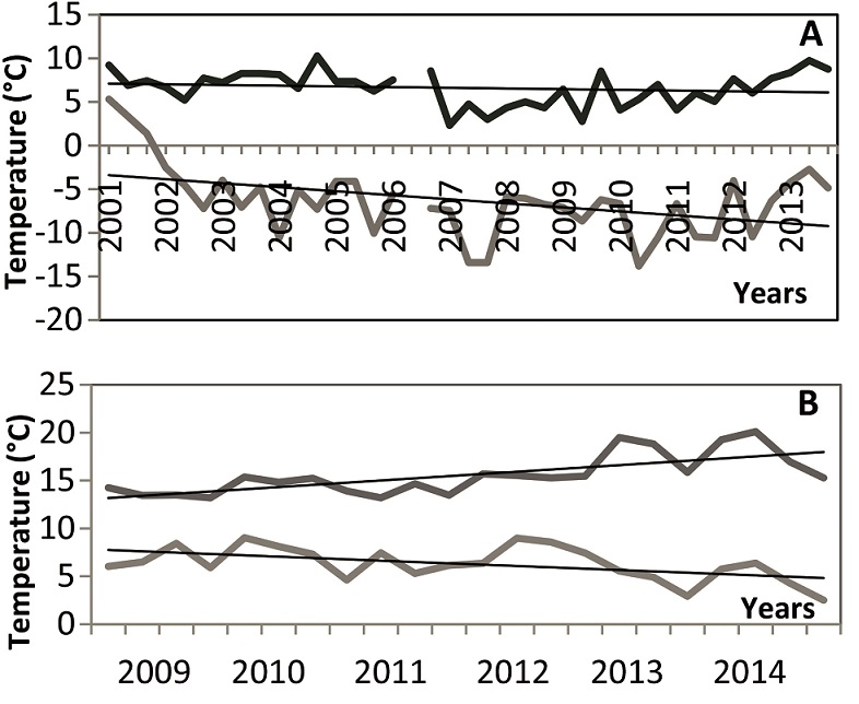 A. Max (black line) and min (grey line) temperature during the cold season (June, July, August) over the 2001-2013 period; B. Max (black line) and min (grey line) temperature during the warm season (December, January, February and March) over the 2009-2014 period.