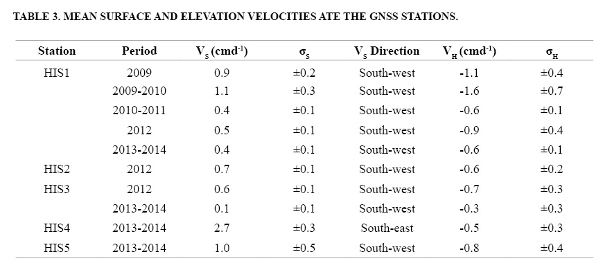 Figure 5 shows the daily rate of the HIS1 station horizontal position changes during the five seasons. The data displays horizontal surface displacements that are similar for the five periods, except for the 2009-2010 season. The mean surface velocities for HIS1 are listed in Table 3, where the accuracy and also the surface movement’s direction are shown. The VS (Surface velocity) values estimated during the 2009 and 2009-2010 field seasons were similar, but the motion rate was reduced by approximately 50% in the following seasons, indicating that the glacier was slowing down and reducing the advance rate towards the terminus. The VH represents a spatial pattern of glacier movement. The lowest velocity, -0.6 cmd-1, and the highest one, -1.6 cmd-1, were observed in the 2013-2014 and 2009-2010 field seasons respectively, with an average velocity of -0.96 cmd-1 for the whole 2009-2014 period. The seasonal VH changes showed an interesting pattern in the 2009-2010 season, due to an increase of approximately 45% in the rate of diminishing elevation change. From December 2010 onwards, the altitude changes began to stabilize and are more constant values in later field seasons.