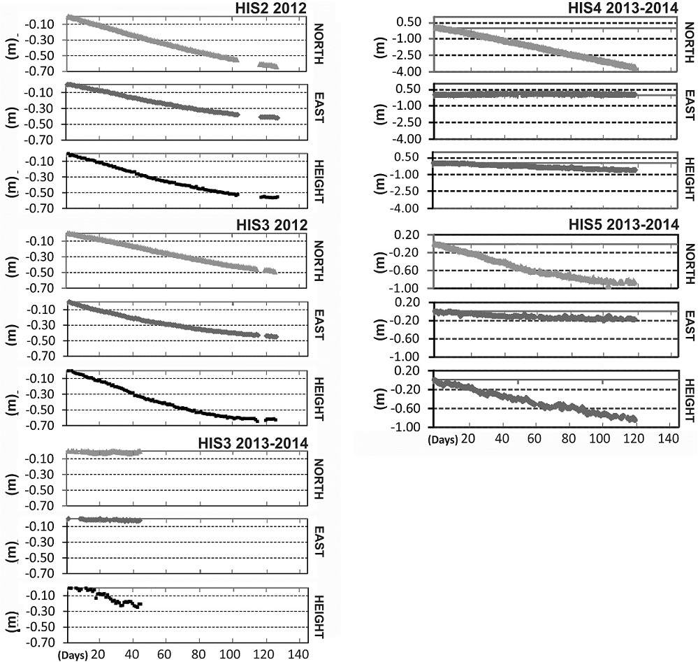Displacement and elevation changes of the HIS2, HIS3, HIS4 and HIS5 stations for the North, East and Elevation component over the 2012-2014 campaigns.