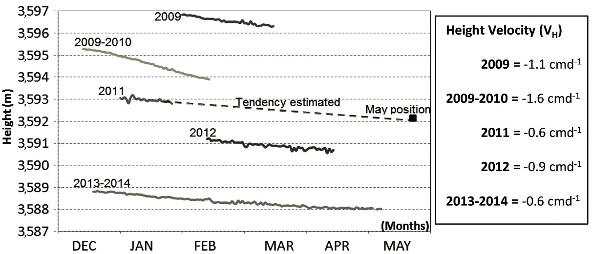 The lowermost portion of the HIG is entering a period of relative inactivity following recent rapid collapse, having recently experienced surface changes over several years (Fig. 6). Similar values of surface velocities were found at HIS1, HIS2 and HIS3 for the 2010-2014 period. The uppermost stations (HIS4 and HIS5), have also shown a major horizontal displacement during the 2013-2014 seasons, which may be related to the influence of an external source such as a rockglacier. Following these changes, velocities in elevation (VH) at the HIS1 site had a large motion rate in the 2009-2012 period, and a thinning increase in 2009-2010 that may be attributed to the low altitude reached by the glacier in 2006 (3,500 m a.s.l.), where the temperatures are above 0 °C, and the ice is prone to melt more quickly. The HIS5 station, in the 2013-2014 season, has the highest rate of elevation change in comparison with the others sites. Elevation changes rates of the GNSS surveys stations at the glacier show a similar variation that may attribute the area chosen for the present study is representative of the HIG.