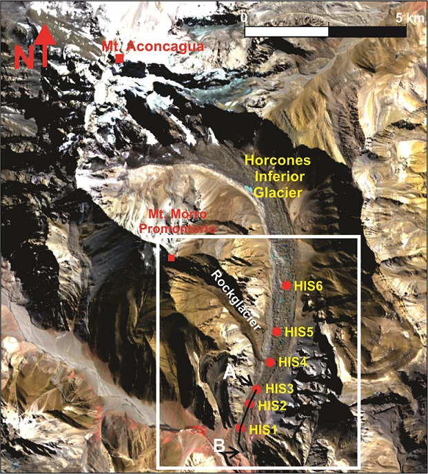 Location map of the study area. A. Location in Argentina, and the Cordillera de Los Andes, South America; B. Oblique view of the study area. Mt. Aconcagua, the Horcones Inferior Glacier and the south wall of Aconcagua are shown.