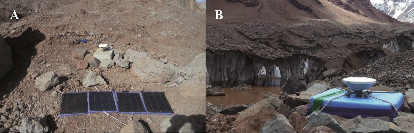 A. HIS1 GNSS station with the antenna mounted on a box platform on the glacier; B. HIS4 station on the HIG surface.