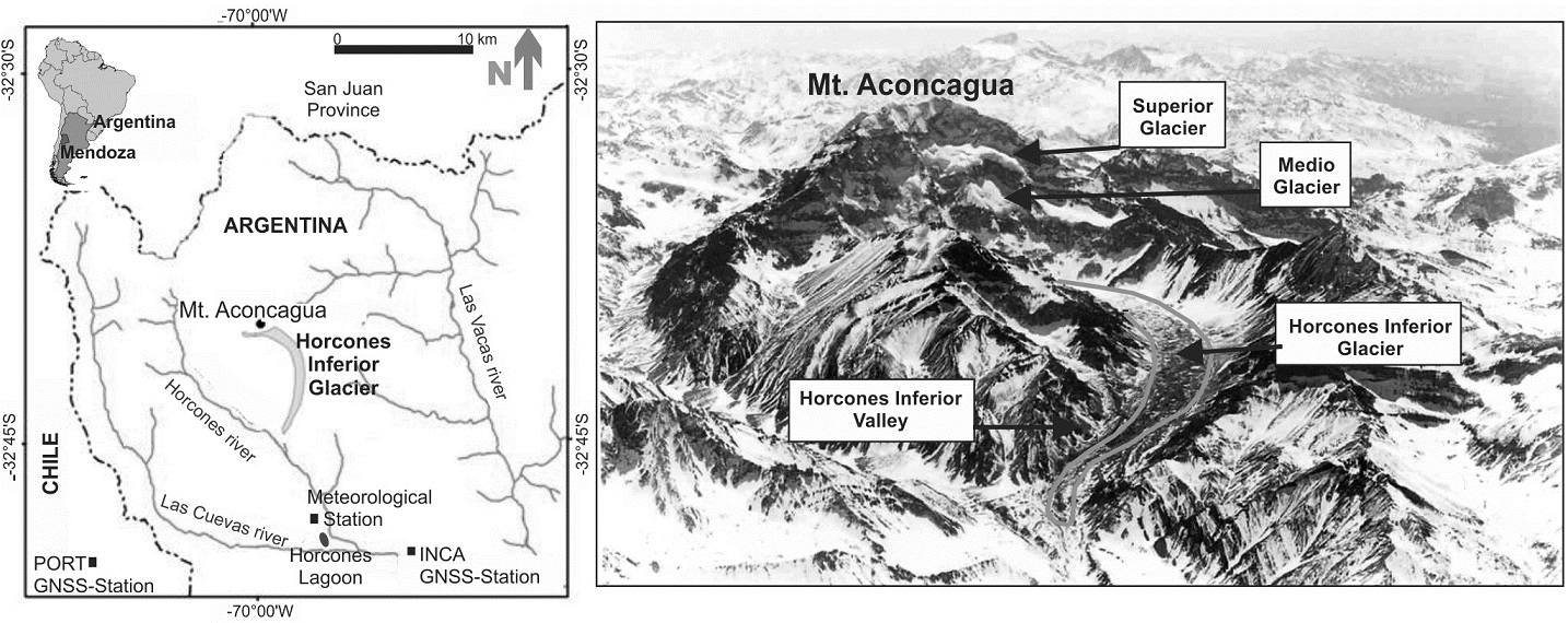 The authors would like to thank A. Ferlito and A. Lo Vecchio for field assistance. S. Bonvalot IRD (Institute de Recherche pour le Développement, France) provided the PORT Station data. The meteorological data is courtesy of the General Irrigation Department of the Mendoza Government, and has records since 2000. The Mendoza Natural Resources Department provided support in the Aconcagua Park. D. Araneo and R. Villalba (IANIGLA) provided valuable comments. We also thank the two anonymous reviewers for their comments on the manuscript, and S. Key for his help in the English version. Fieldwork was funded by grant PICT 02220/07 Agencia Nacional de Ciencia y Tecnología Argentina (ANCyT) and “Sistema de Investigaciones Geodinámico Monte Aconcagua” Project (SIGMA).