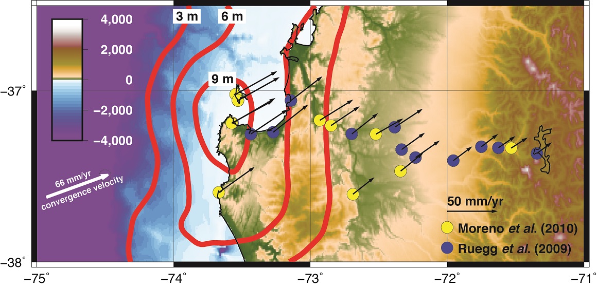 Fig. 1. GPS-derived surface velocity vectors across a trench-perpendicular transect at Arauco Peninsula (aprox 37.3º S) in south-central Chile (topography/bathymetry of the area is color-coded). Vectors where calculated by Ruegg et al. (2009, blue dots) and Moreno et al. (2010, yellow dots) from campaign measurements done before the Mw8.8 2010 Maule earthquake. Contours of 3, 6 and 9 m of co-seismic slip of the 2010 event are shown in red (Moreno et al., 2012). The convergence velocity vector is shown as a white arrow.