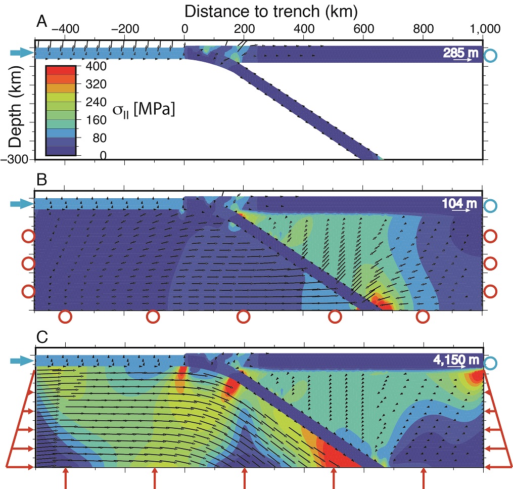 Fig. 10. Three models set with code ADELI, in order to illustrate the mechanical interaction between the slab and the mantle, Each three cases impose a tangential velocity along the base of the subducting plate, and no motion at the base of the overriding plate (as in the previous section). The deviatoric shear stresses that develop inside both plates reach ~100-200 MPa (turquoise to green), and are identical in all three cases. However, all 3 cases assume different conditions for the underlying mantle. A. Model AM-0 assumes that the mantle behaves as an inviscid fluid; B. AM-1 includes a mantle with temperature dependent viscosity (on average, of the order of 10² Pa.s): its lateral and bottom borders are set free-slip (similar to models in section 3). C. AM-2 includes a mantle of similar rheology but its boundaries react to Archimedes’ restoring force (as if embedded in an infinite half space). The large stress field generated in the mantle results from the kinematic conditions applied on to the base of the plates, thus showing that they are out of mechanical balance.