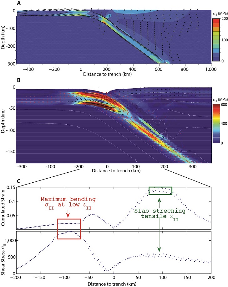 Here we illustrate how flexural stresses develop in the long-term in a subduction zone. Therefore we display model LM, which is built with the finite-differences code Parovoz (Poliakov and Podladchikov, 1992), and assumes conditions similar to those defined by Gerbault et al. (2009), Dorbath et al. (2008) and Sobolev and Babeyko (2005) when studying the influence of rheology on deformation along the Chilean margin over several millions years. This model considers subduction over a time-scale of 4 Myrs and assumes self-consistently defined temperature-dependent elasto-visco-plasic rheology. Therefore the slab-mantle boundary is also self-consistently defined and consists in a continuous transition from competent (effectively elastic) plates to low viscosity asthenosphere. The setup is defined with the synthetic geometries of a bent slab which is pushed from its right-end side, eastward at the velocity of 4 cm/yr, while the overriding plate is remained fixed (free-slip far-field left-end of the model). At the base of the model domain the slab is also pulled downwards in the direction parallel to its inclination, at 4 cm/yr. As a result, flexural stresses build up and equilibrate within 4 Myr (Fig. 11b), using the flexure of the resistant slab to equilibrate the applied boundary conditions. Figure 11b displays the stress field via its 2nd invariant. Highest values occur where slab curvature changes: these stresses approach 1 GPa at the bottom corner of the flexed lithosphere (sampling of the displayed values was made at depths corresponding to the 590-620 ºC isotherm interval, Fig. 11c). Thus we illustrate here that although the bent corner of the slab does not undergo much internal deformation (red rectangle domain in figure 11c), it actually stores large bending stresses capable of exceeding the brittle-yield strength.