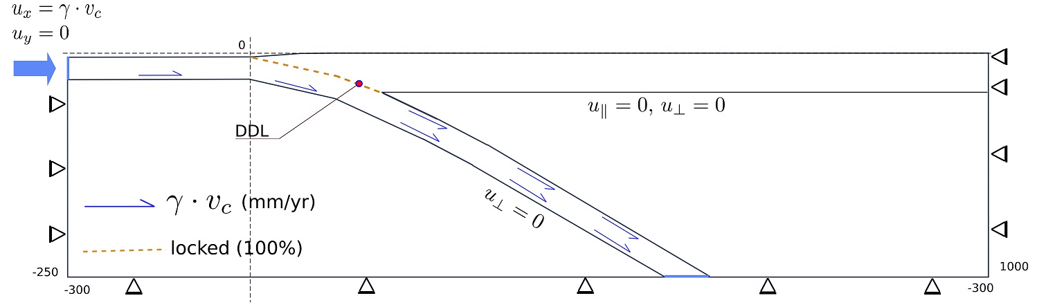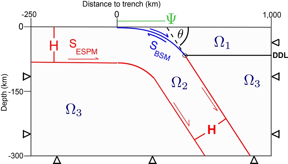 In order to simulate the elastic deformation produced by interseismic plate locking at subduction zones we use the finite-element method (FEM) to develop a 2D model in which displacement along a fault plane is implemented based on a split node technique (Melosh and Raefsky, 1981). We start with a conceptual model of an idealized subduction zone whose general configuration setup is shown in figure 2. This setup can indistinctly reproduce the BSM or the ESPM. For both models the subduction geometry is characterized by two parameters: Θ is the dip angle of the slab below the locked seismogenic zone and DDL is the depth to the Downdip Limit at which both plates are locked. For sake of simplicity as a first step, the DDL also corresponds to the limit between the upper plate and the underlying asthenospheric mantle (Fig. 2). Different domains (upper plate, subducting plate, asthenospheric mantle) can be recognized with eventually different values of the Young Modulus. The upper surface of the model is assumed to be stress free (i.e., it freely deforms) whereas along the lateral and bottom boundaries (extending down to 300 km in the mantle) no displacement is allowed (anchored boundaries). For the ESPM setup, a subducting plate of thickness H is defined and its motion is imposed as a boundary condition at its left-hand border. On the opposite edge of the slab at 300 km depth, free motion is allowed. In order to simulate the kinematic conditions of the interseismic phase, we impose a uniform slip along the boundaries of the elastic plate with the asthenospheric mantle (red lines in figure 2), and assume a 100%-coupled seismogenic zone (continuous deformation and stress in between the upper and lower plate from the top surface to the DDL depth). In contrast, in the simpler geometric setup corresponding to the BSM, a homogeneous slip is imposed along the seismogenic zone (blue line in figure 2) and all other boundaries are fixed.