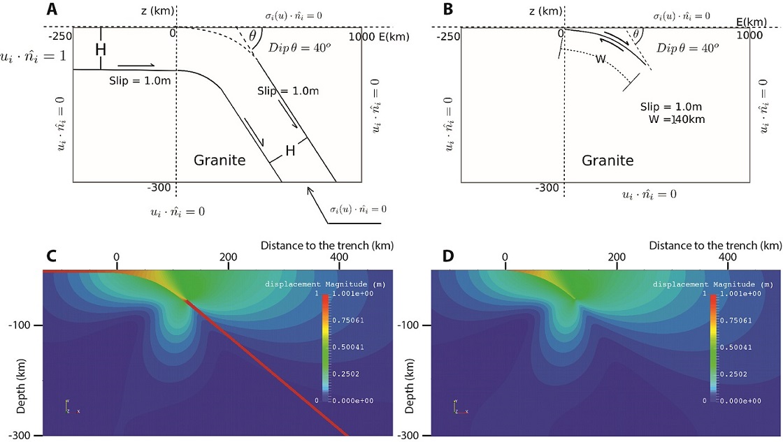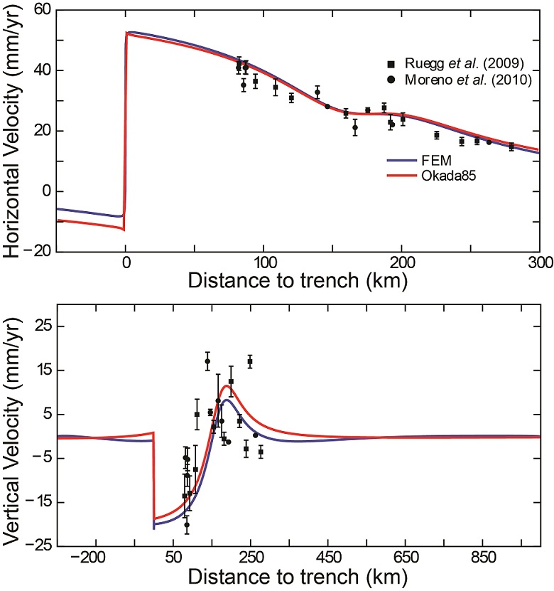 In the attempt to construct a conceptual model that could describe the subduction process in a more realistic way, and yet preserve the simplicity of the kinematic link between geodetic observations and plate locking, Kanda and Simons (2010) proposed the Elastic Subducting Plate Model (ESPM). This model is based on a previous conceptualization of Zhao and Takemoto (2000) and considers a subducting elastic slab of finite thickness coupled to an elastic upper plate along the seismogenic megathrust zone that moves with respect to the surrounding asthenospheric mantle. The ESPM also includes the kinematic effect of slab flexure near the trench axis by considering a decreasing velocity gradient along the slab’s radius of curvature. Plate flexure and its associated bending stresses have been shown to be a fundamental process that connects the dynamic force balance of tectonic plates with the seismic cycle (Conrad et al., 2004; Capitanio and Morra, 2012; Schellart, 2009; Buffett and Rowley, 2006). As demonstrated by Kanda and Simons (2010), the ESPM mimics the deformation field caused by the BSM when the thickness of the subducting plate tends to zero. However, if at least a portion of flexural stresses is not continuously released in the shallow portion of the subduction zone, then the predicted surface velocities of both models can differ significantly. This conclusion implies that the interpretation of geodetic observations within the framework of more (ESPM) or less (BSM) realistic approaches for assessing the degree of interseismic plate locking (and the maturity of a seismic cycle), remains to be developed together with an understanding of its mechanical implications.
