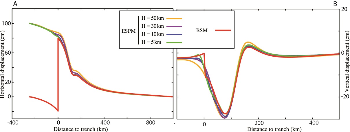 The similarity between both models can also be appreciated in figure 4, which displays horizontal and vertical components of the surface displacement obtained from a BSM and from a ESPM with different plate thicknesses H between 5 and 50 km. Landward from the trench the solutions of the BSM and the 5 km thick slab ESPM are almost identical, while they both differ significantly with increasing slab thickness.
