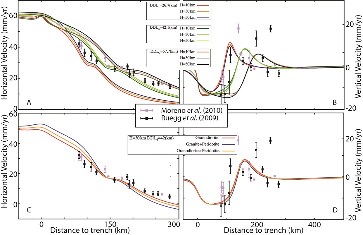 Fig. 7. ESPM Model results compared with GPS velocities along the Arauco Peninsula. Left-hand and right-hand panels show horizontal and vertical velocities respectively. With respect to uncertainties of GPS observations, surface displacement produced by the ESPM with realistic subduction geometry is almost insensitive to slab thickness H (as shown in A and B). Young Modulus E of the upper plate has a minor effect (as shown in C and D). Displacement is mostly controlled by the Downdip Limit (DDL) of interplate locking. Even our best fitting model (H=30 km, Granodiorite, DDL=42 km) is unable to reproduce the observed GPS velocities.