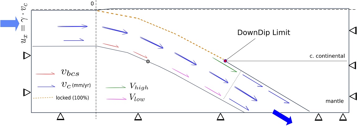 With this setting, we try to reproduce the interseismic horizontal surface displacement observed with the GPS data. In a first attempt, we express a potential reduction of velocity at the bottom of the slab (vbcs) with respect to the applied convergence velocity (vc), which results from plate bending at the trench (Kanda and Simons, 2010). This velocity can be evaluated geometrically and it is non-uniform below the seismogenic zone as defined by vbcs =γ( (1-H/R)/(1-H/2R)), with H the thickness of the slab and R its local radius of curvature. γ is a parameter between 0 and 1 that allows us to express this reduced velocity at the base of the slab.