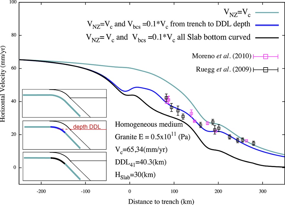We then show that this misfit can be corrected by introducing a reduction in the velocity at the bottom of the subducting plate below the coupling zone. Now we consider the same configuration as described in the previous section, but we modify the velocity distribution along the bottom boundary of the subducting plate, as illustrated with arrows of different colors in figure 8. One configuration considers that this basal velocity is constantly reduced by a factor γ=0.1 with respect to. When we apply this velocity reduction to the entire curved bottom of the slab, the resulting surface deformation is largely reduced well below the level given by GPS measurements (black curve in figure 9). However, if we apply this reduced velocity along the bottom of the slab from the trench only down to the DDL depth, then the match to GPS observations is strongly improved (blue curve in figure 9).