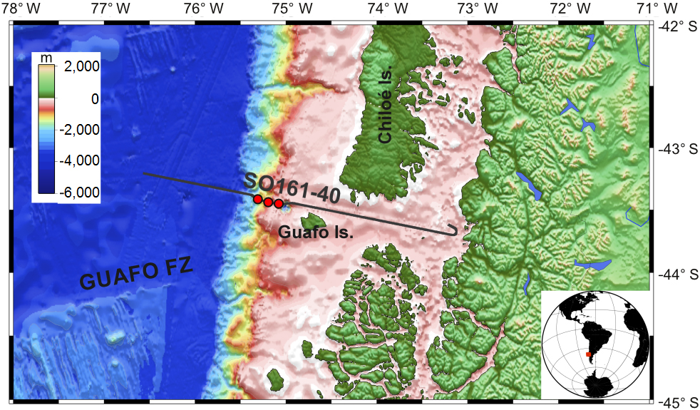 Offshore Chilean margin and offshore Antarctic Peninsula important gas hydrate reservoirs have been detected in the last years (see for example, Vargas-Cordero et al., 2010, 2011 and Loreto et al., 2011). These regions are very sensitive to climate change as pointed out by recent studies (i.e., Marín-Moreno et al., 2015), confirming that it is necessary to increase our knowledge about the quantity of gas trapped in marine sediments in order to include it in the global carbon cycle. In this context, we focused our attention to the southwest part of Chiloé Island across the continental slope between 43° and 44° S (Fig. 1). This area is characterized by subduction of Nazca Plate below the South American continental plate along the Perú-Chile trench at a rate of about 66 km Ma-1 (Angermann et al., 1999; Kendrick et al., 2003). Seismic line SO161-40, analyzed in this study, is located in the area where the last glaciations have modeled the Chilean southern margin (Rabbasa and Clapperton, 1990) and the tectonic evolution of the fore arc basin included an inversion from tectonic erosion to accretion (Melnick et al., 2006). These aspects are important to consider in the seismic analysis across the BSR, because tectonic processes and glaciations determine seismic velocity changes that must be distinguished from those induced by the distribution of hydrate and free gas in the sediment pore space.