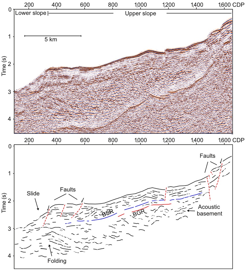 - Landward sub horizontal and discontinuous reflectors characterized by normal faults in the upper continental slope (CDP 300 to 600). Below these sediments, a high amplitude reflector with evident folding about 1 s from the seafloor is recognized. Note that a weak and discontinuous BSR is detectable.