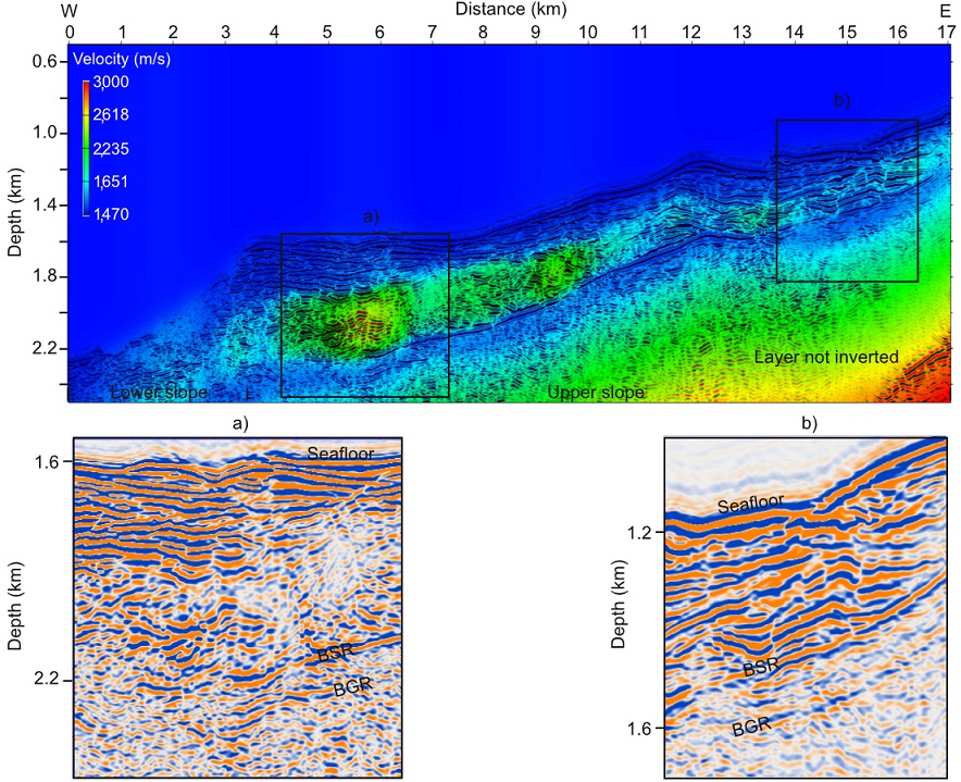 The final velocity model shows the layer above the BSR characterized by high velocity (1,800-2,200 m/s), with respect to the normal compacted marine sediments (Fig. 3), which can be associated to gas hydrate presence. A layer below the BSR is characterized by low velocity (1,600-1,700 m/s) and can be associated to free gas presence (Fig. 3). A strong lateral velocity variation is evident along the section. In particular, a low velocity across the BSR is reached upward of upper continental slope (km 12-13), while a high velocity above the BSR is present downward of it (km 4-6).