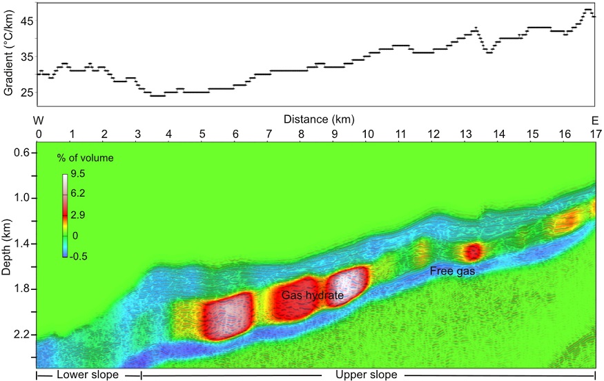 A variable geothermal gradient along the seismic section is recognized, with a maximum value equal to 45 °C/km, located in correspondence to the uppermost part of the continental slope, and a minimum value equal to 25 °C/km westwards of it (Fig. 4). Note that the highest value is in proximity of the border line and can be affected by a higher uncertainty than the values estimated in the central part of the seismic line. The theoretical BSR depth is evaluated considering that the hydrate contains only methane, as discussed in the previous paragraphs.