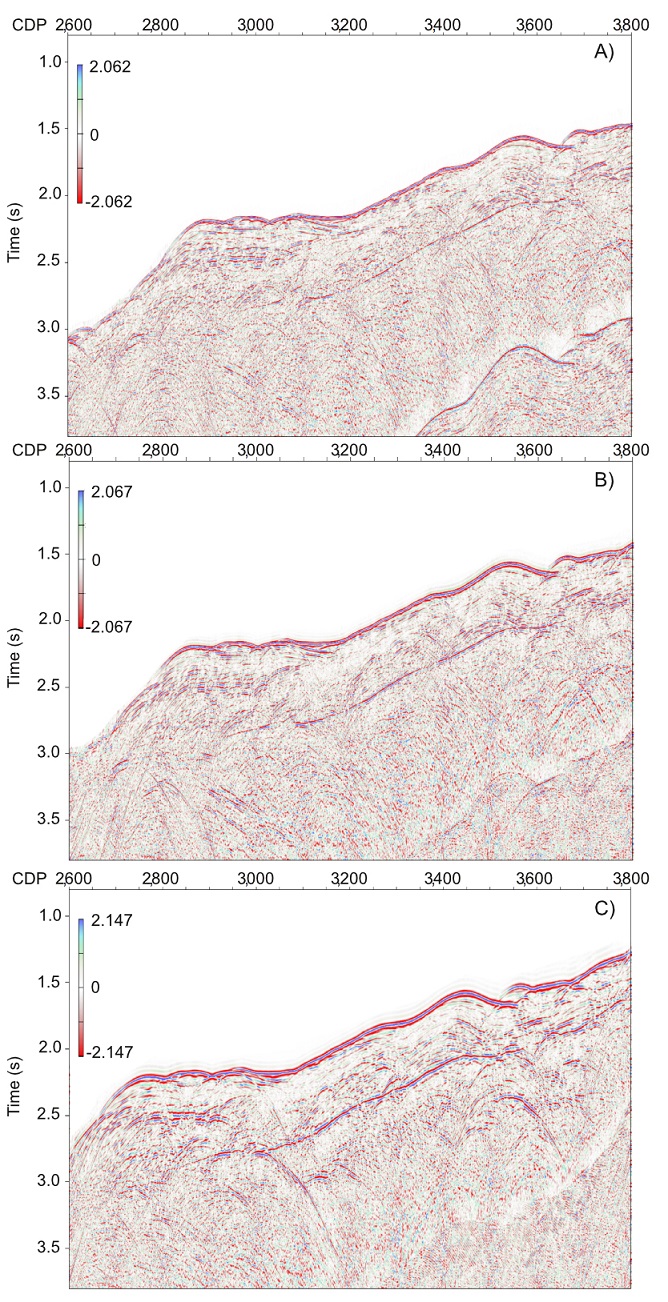 Fig. 5. Stack sections by using the traces with an offset ranging between 150 m and 500 m (panel A), between 500 m and 1,700 m (panel B) and greater than 1,700 m (panel C).