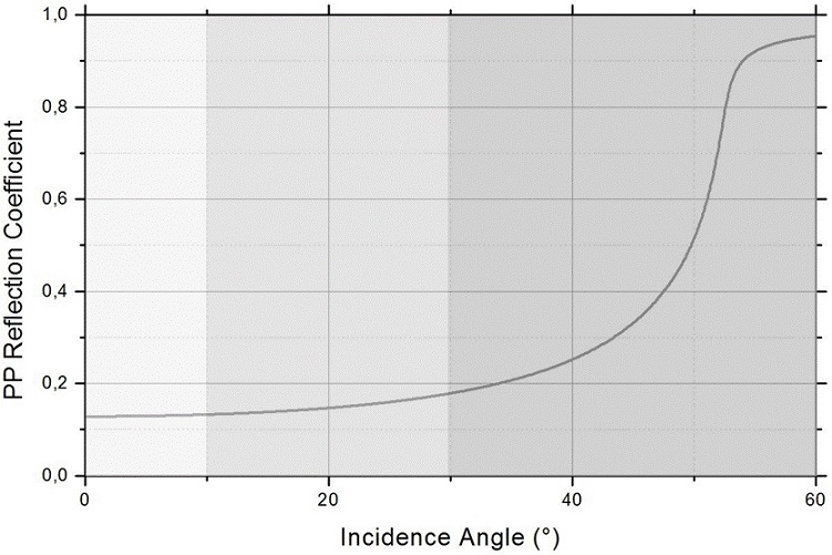 Fig. 6. Theoretical AVO curve. Dashed areas are related to offset ranging (0°-10°: near offset; 10°-30°: medium offset; greater than 30°: far offset).