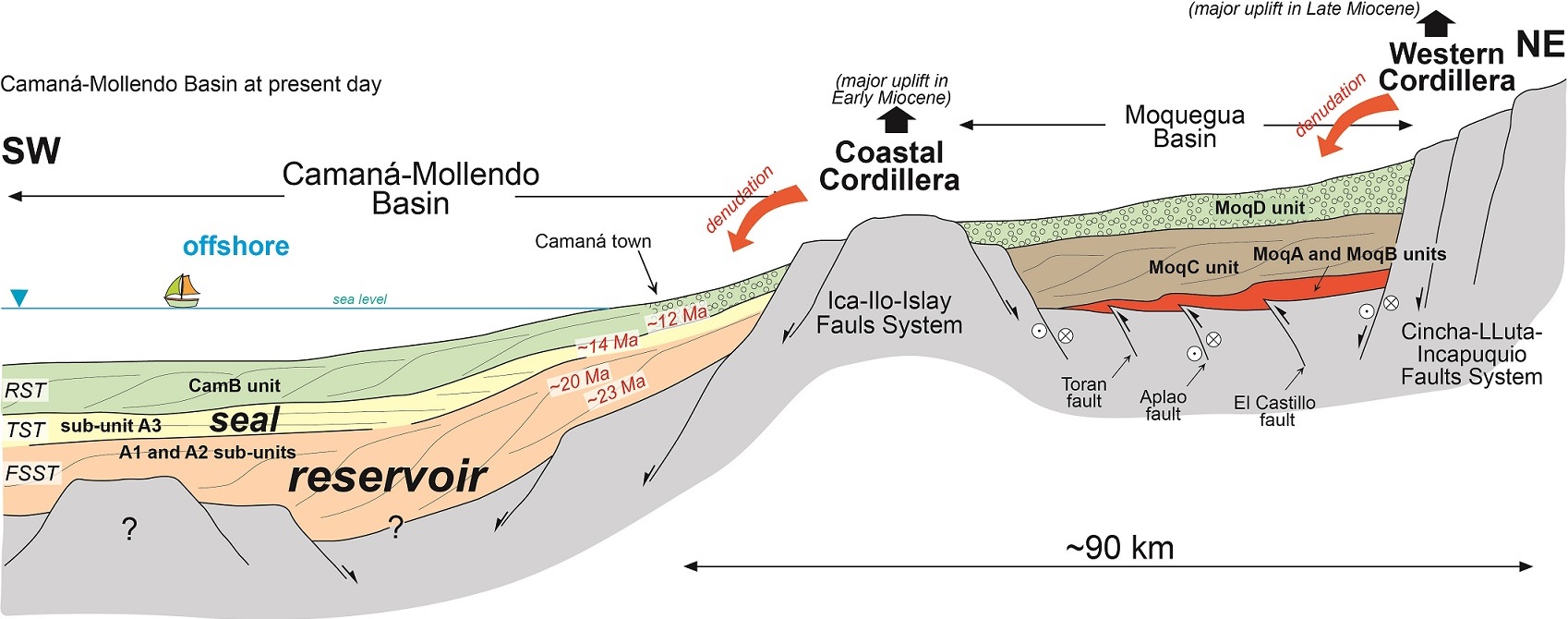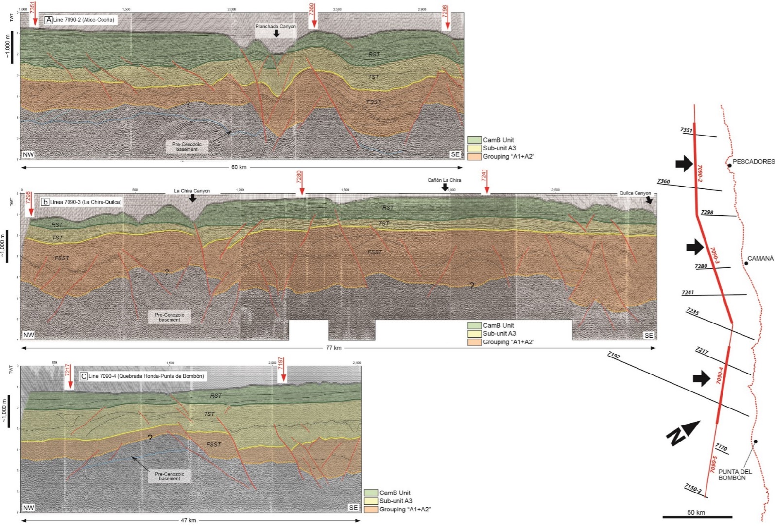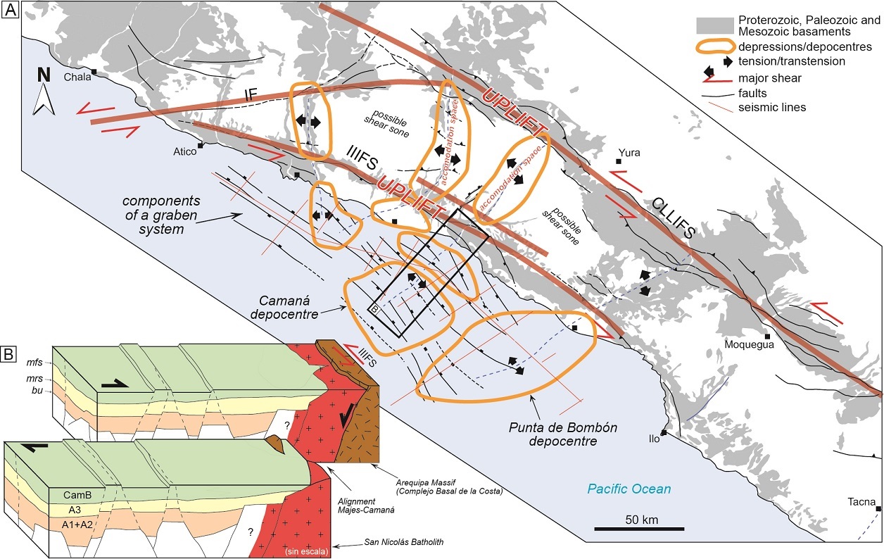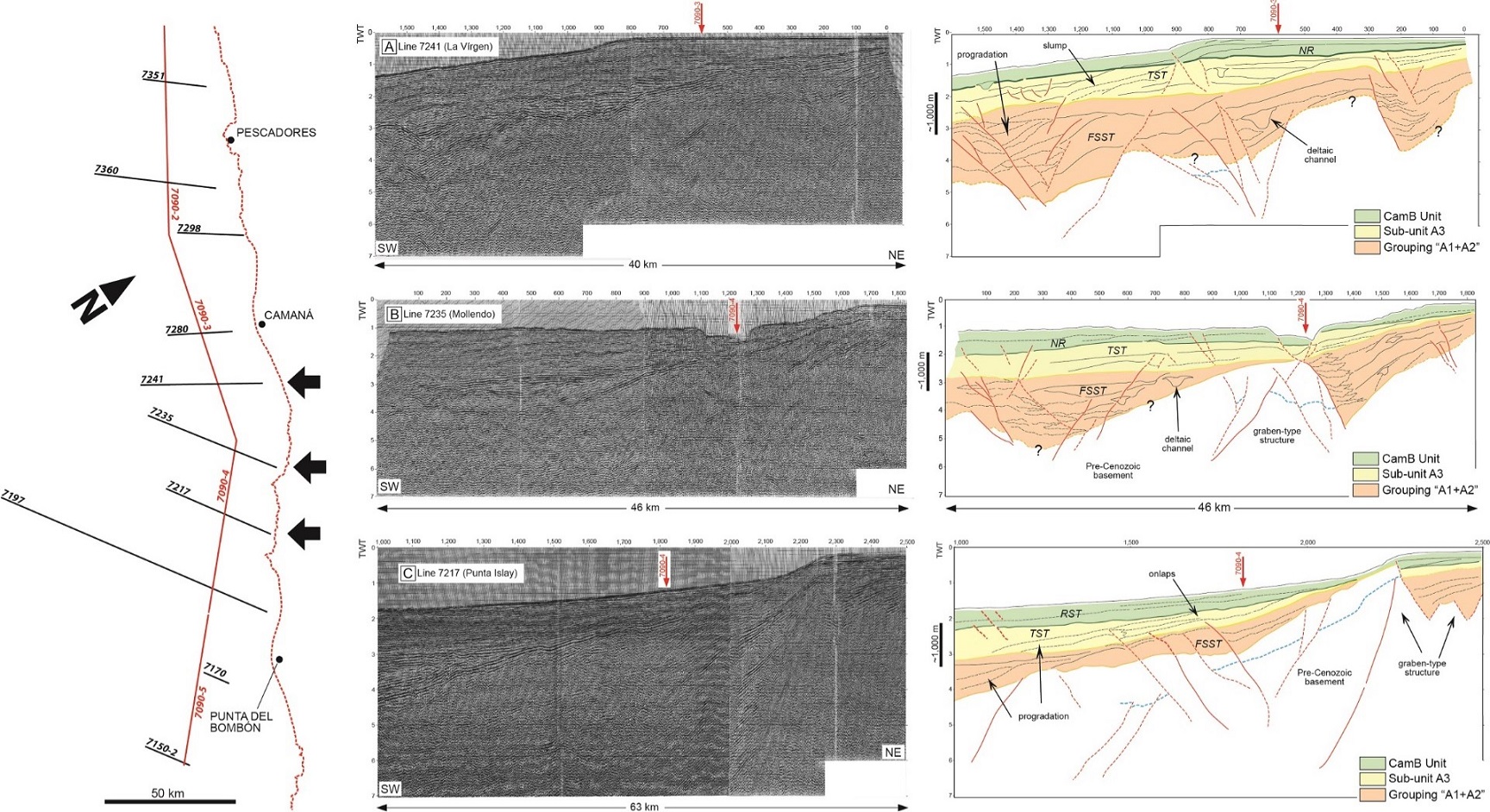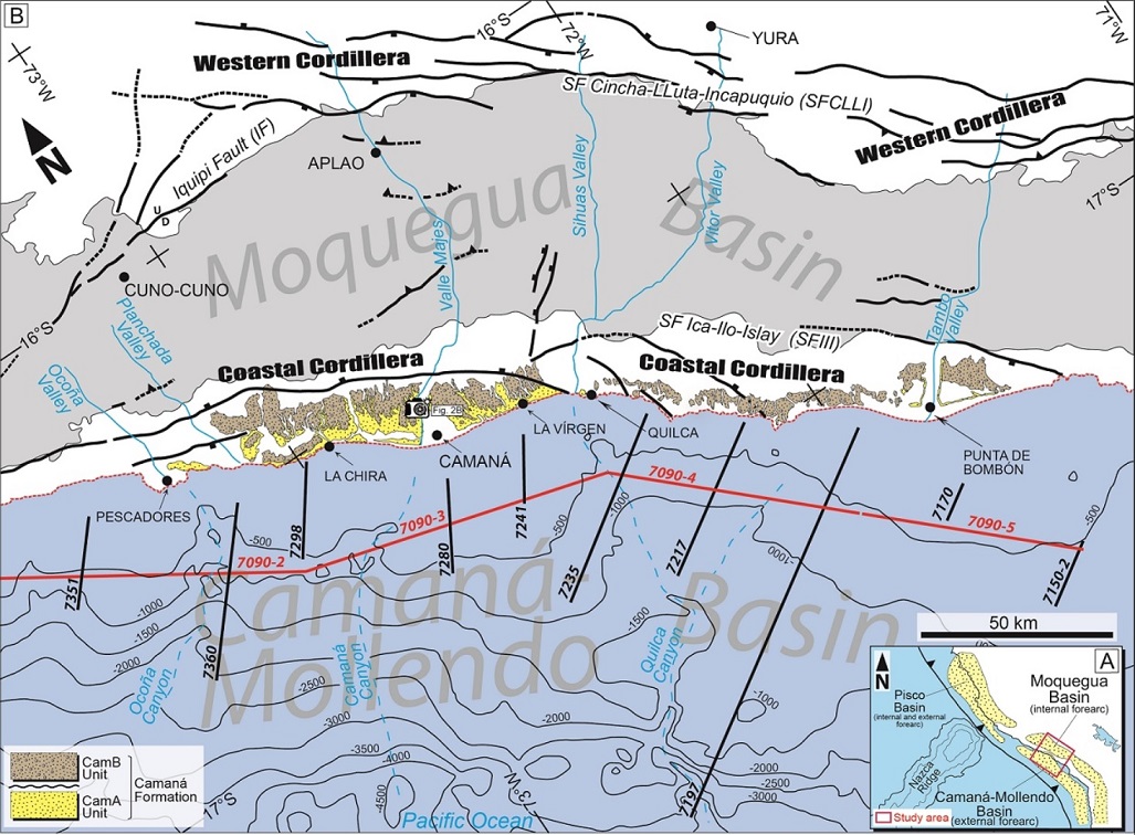 The main objective of this manuscript is to explain the chronostratigraphic and structural organization of the Cenozoic Camaná Formation in onshore and offshore of southern Perú, and explain the origin and location of sedimentary depocentres that are attractive for oil exploration. To accomplish these goals, we needed to integrate new interpreted seismic data (~647 km of 2D seismic profiles) with previous studies on sedimentary provenance (including heavy mineral analysis and U-Pb geochronology on detrital zircons), previous sedimentary facies analysis, and sequence stratigraphy (e.g., Vega, 2002; Alván and von Eynatten, 2014; Alván et al., 2015). The results will define the chrono-stratigraphic and structural framework of the Camaná-Mollendo Basin and predict sedimentary extension in the offshore of Camaná.