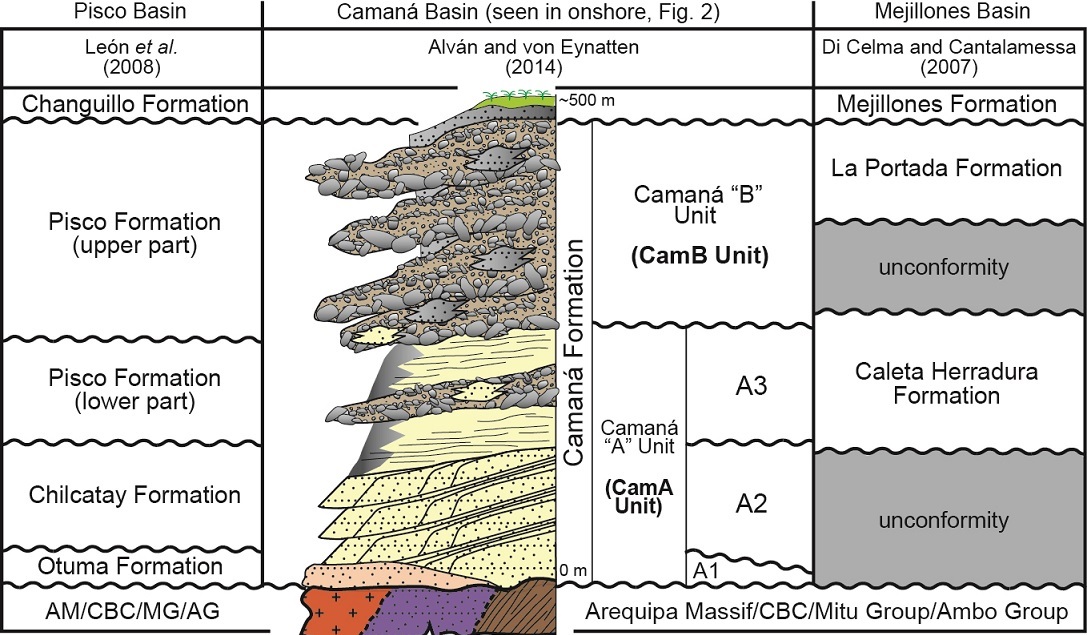 We consider the latest update on the facies analysis and chrono-stratigraphy of the Cenozoic Camaná Formation by Alván and von Eynatten (2014) (Fig. 2), as well as the latest sedimentary provenance model of the Camaná Formation suggested by Alván et al. (2015), in order to characterize the deposits of Camaná Formation. The purpose is to correlate and/or compare each deposit in onshore to its equivalent in offshore with the most consistent arguments.
