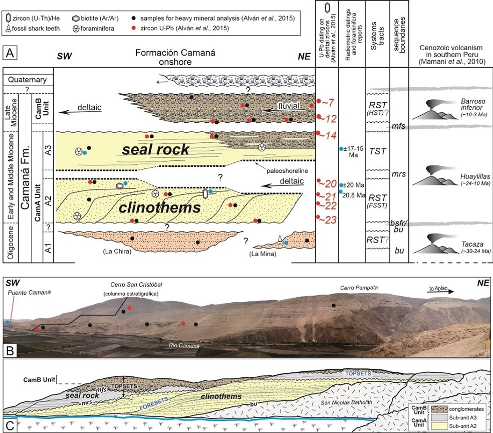 FIG. 2. Chronostratigraphic chart of the Camaná Formation (onshore) and stratotype of Camaná Formation (Puente Camaná). A. according to Alván and von Eynatten (2014), subunit A1 consists of mouth bars and distributary channels tentatively assigned to the Late Oligocene. Subunit A2 consists of progradational clinothems formed during a falling stage systems tract (FSST) in ~Early Miocene. We consider useful to group “A1+A2” and consider them as Oligocene to Early Miocene in age (as Alván et al., 2015). Subunit A3 consists of onlapping deltaic sandstones deposited during a transgressive systems tract (TST), Middle Miocene. CamB is deposited during a regressive systems tract (RST) (or very possibly a highstand systems tract, HST) in Late Miocene to Pliocene; B. samples acquired for U-Pb dating on detrital zircons presented by Alván et al. (2015). C. depositional geometries of within the Cenozoic Camaná Formation. Abbreviations: bu=basal unconformity, bsfr=basal surface of forced regression, mrs=maximum regressive surface, mfs=maximum flooding surface.