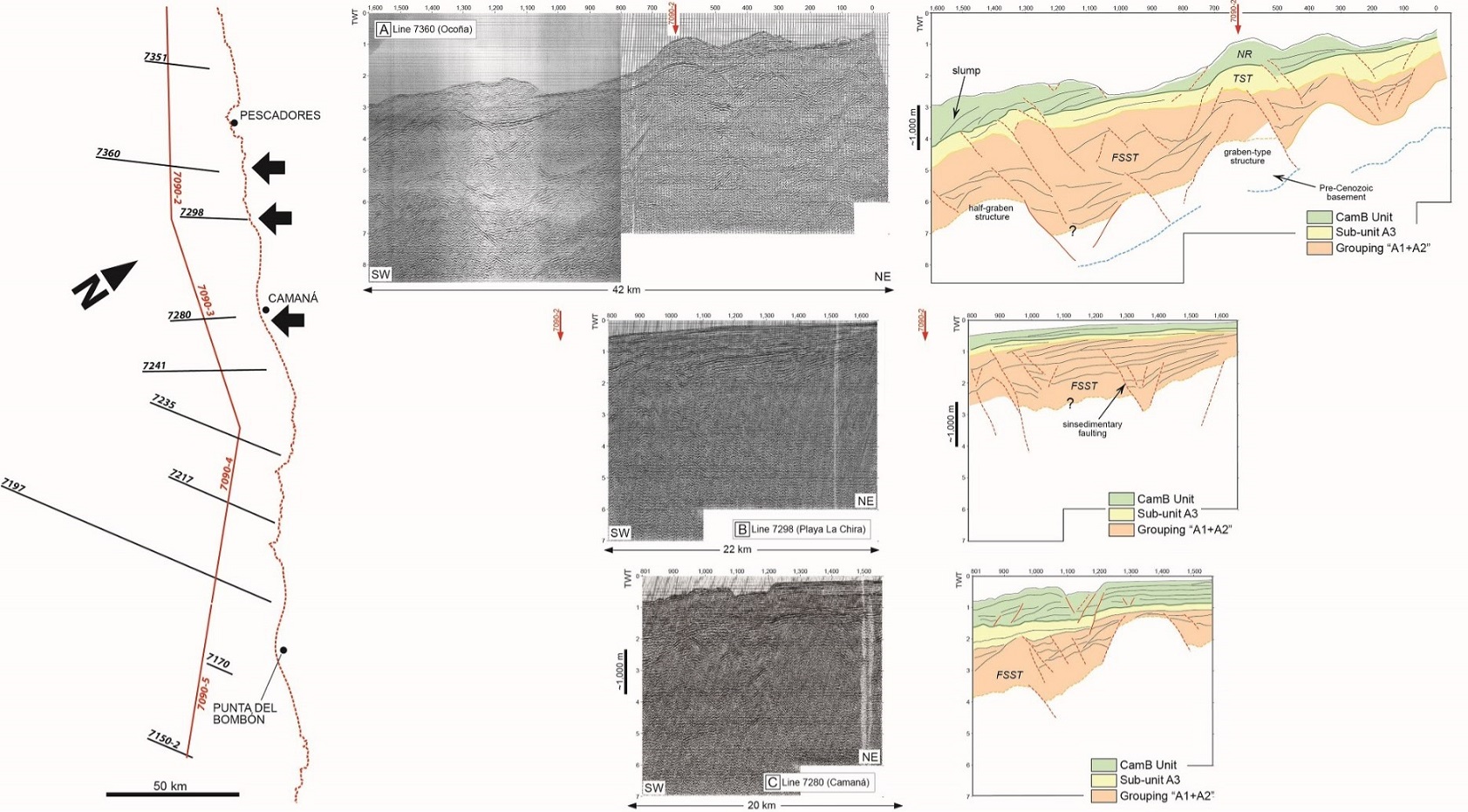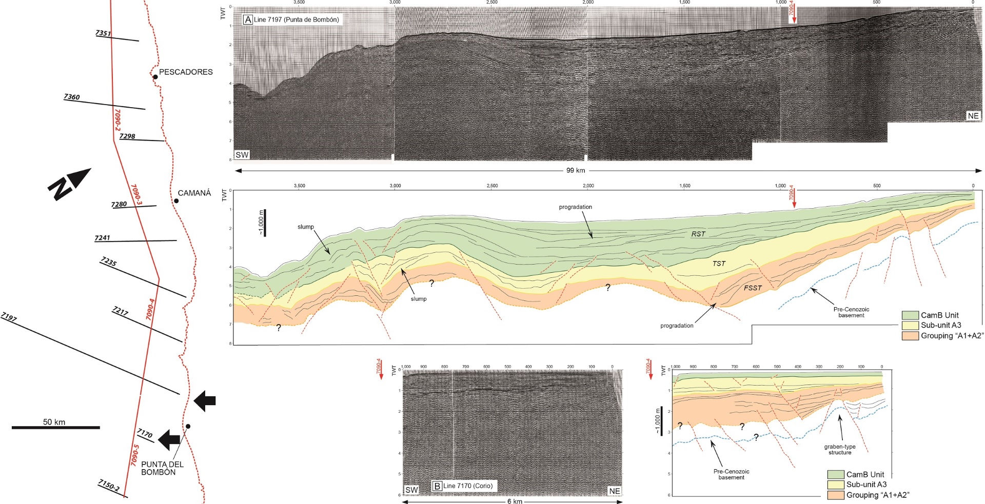 According to field observations (Alván and von Eynatten, 2014), deposits of CamB unit lie above a maximum flooding surface (mfs). Deposits of CamB Unit are represented in light green polygons in figures 3, 4, 5 and 6. These deposits change laterally (toward offshore) to deltaic deposits, showing geometries which are typical of progradational and downlapping deltas. Downlapping terminations are observed in most of CamB deposits (for instance, line 7280 of Camaná in figure 3C; line 7241 of La Virgen in figure 4A; and line 7197 of Punta de Bombón in figure 5A). Seismic lines ~NE-SW-oriented reveal that strata of CamB are not so far affected by faulting during sedimentation; however, few graben-type fault scarps are observed in the lines, and they also can be traced along the marine floor (~96 km from Pescadores to Punta de Bombón, see black continued lines in figure 7).